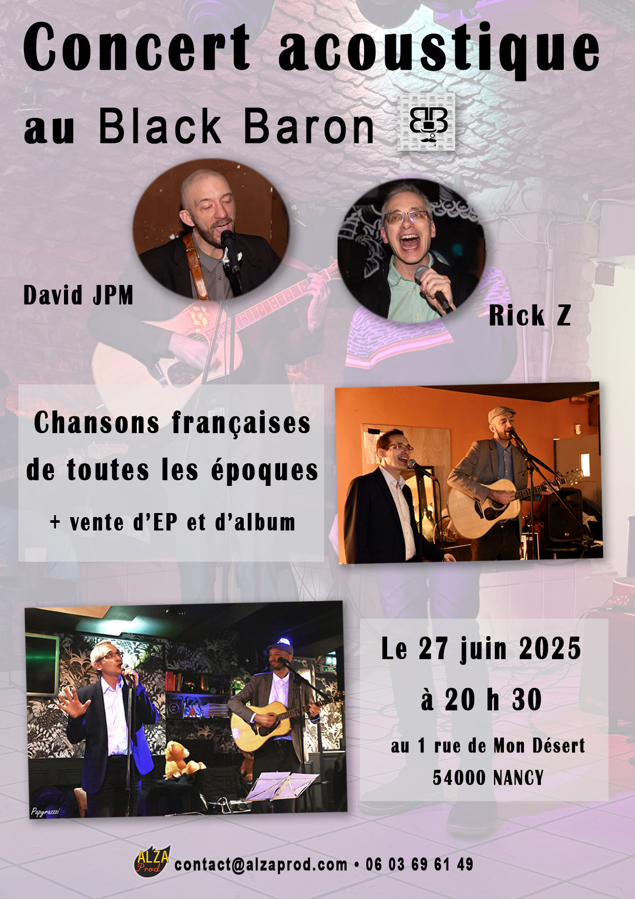 Le guitariste chanteur David JPM et le chanteur Rick Z vous invite à leur concert acoustique, avec + de 20 chansons populaires issues de la variété française, de toutes les époques. Des succès de Charles Aznavour, Jeck, Bénabar, Pierre de Maere, Michel Berger, Alain Souchon, Francis Cabrel, Jean-Jacques Goldman, Vianney, Gérald de Palmas, Jacques Brel, etc.