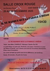 Spectacle jeune public de Jean-Marc Chapelet. Création 2025. Le petit Diégo ne parle pas. Perlinois, son papa, l’emmène au pays qui libère la parole. Leur