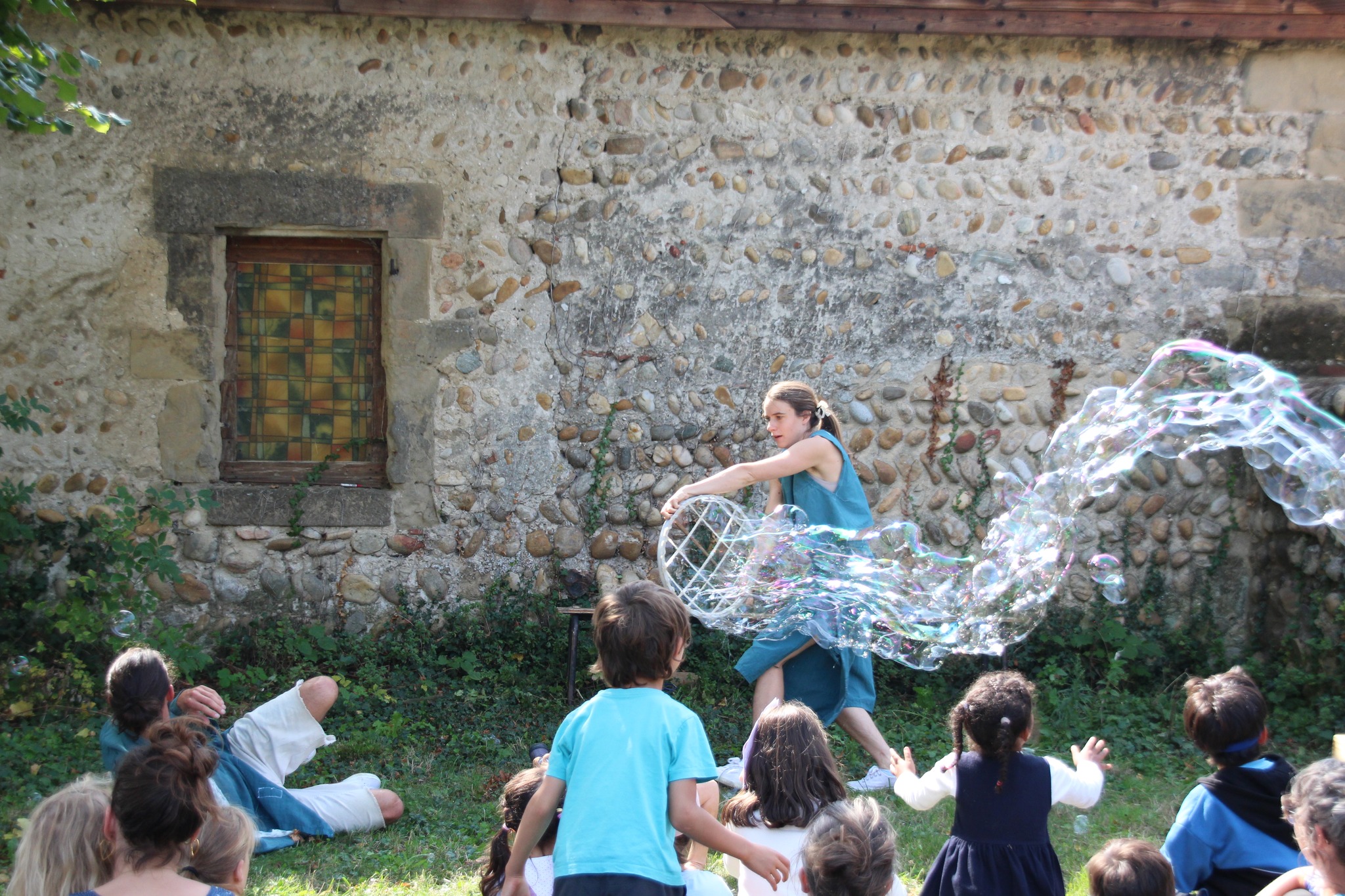 À Pleines Bulles est un spectacle déambulatoire pour l’espace public, une parenthèse enchantée où les mots dansent, les bulles chuchotent, et les objets prennent vie.