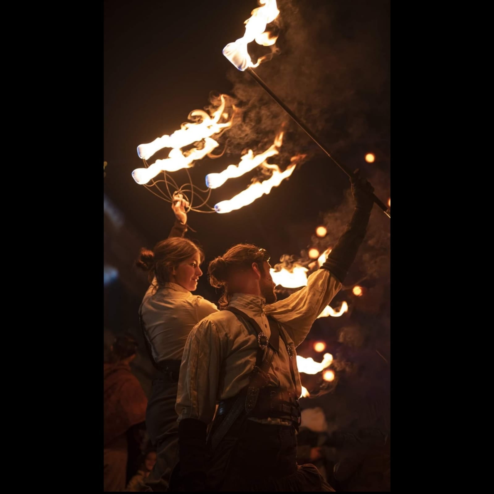 Nos lutins farceurs et espiègles se mêlent à la foule avec leurs agrès de feu pour mettre une ambiance festive et conviviale !