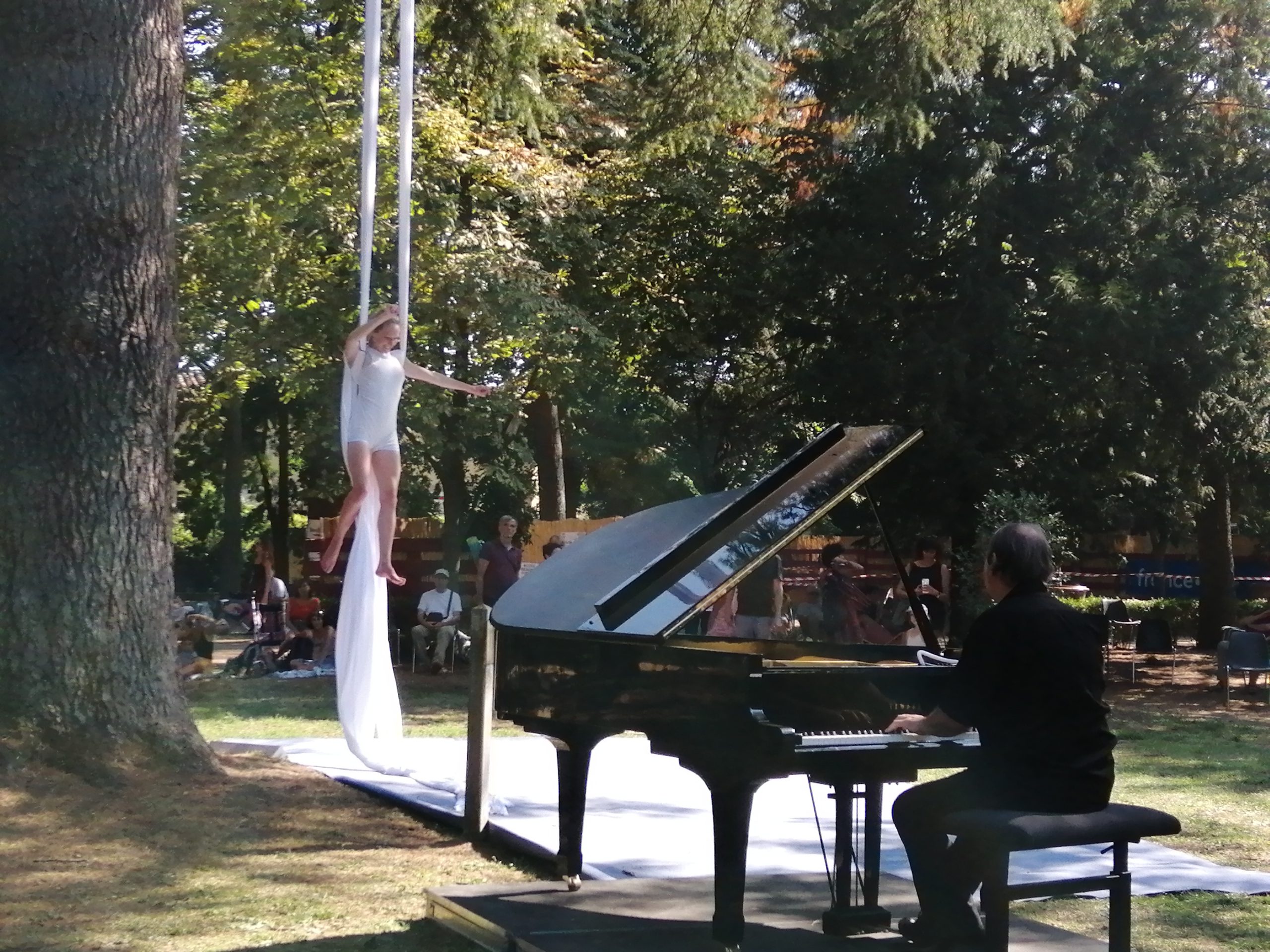 Spectacle possible en intérieur (tissu accroché aux perches ou à notre portique) et en extérieur (tissu accroché en arbre ou à notre portique). Nous pouvons être autonomes techniquement.