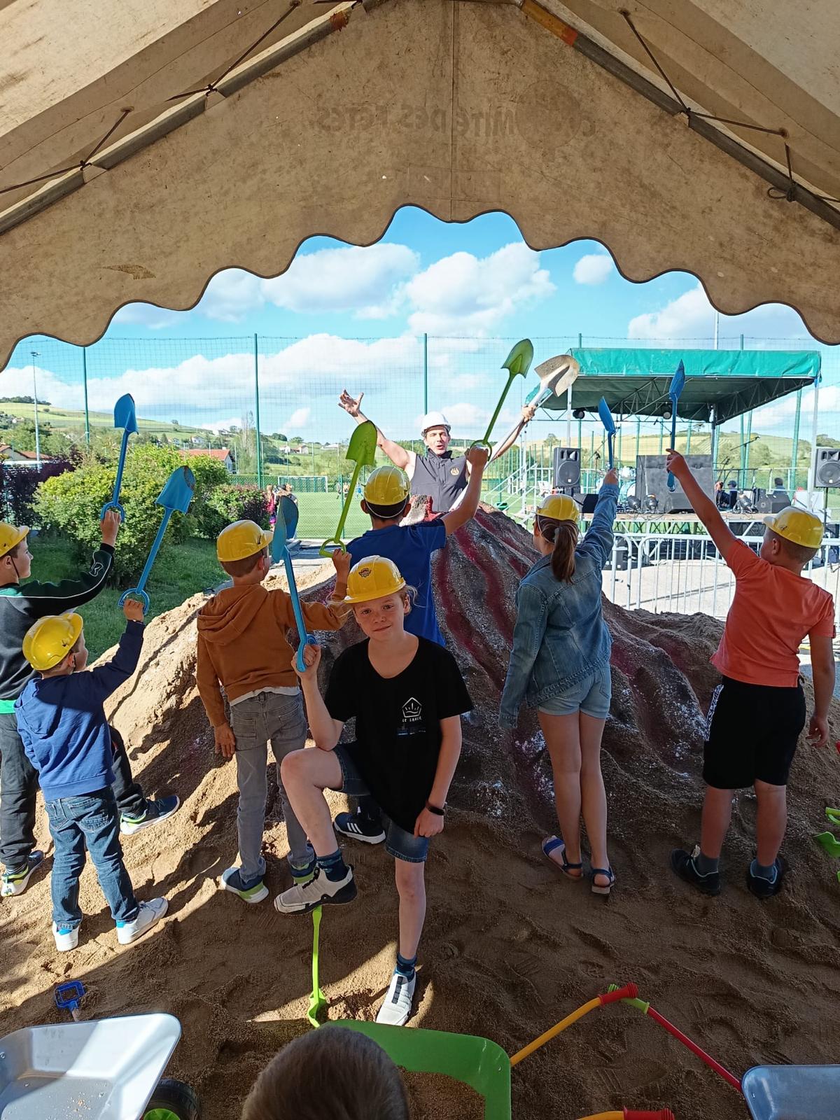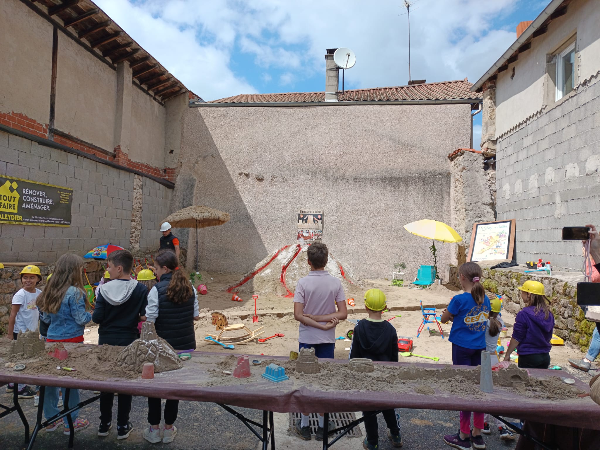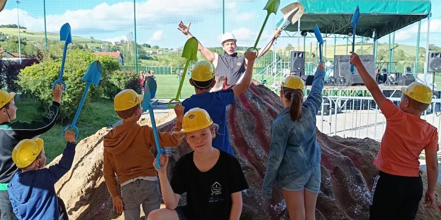 Casque sur la tête, pelle et brouette en main, ils entrent dans la peau de véritables bâtisseurs. Ensemble, ils participent à la construction d’un volcan monumental de sable, pièce centrale de l’animation.