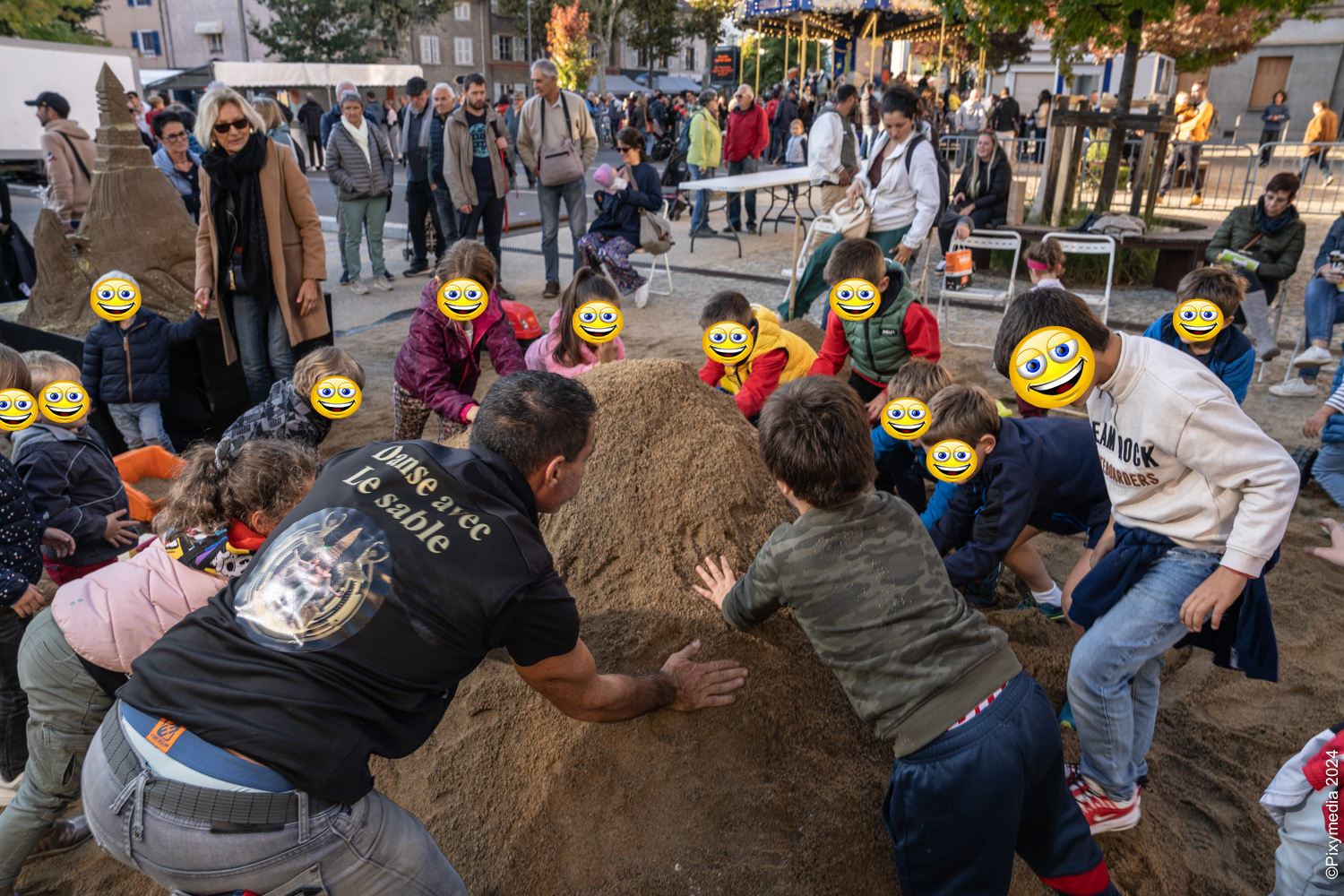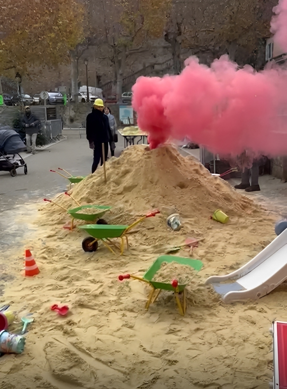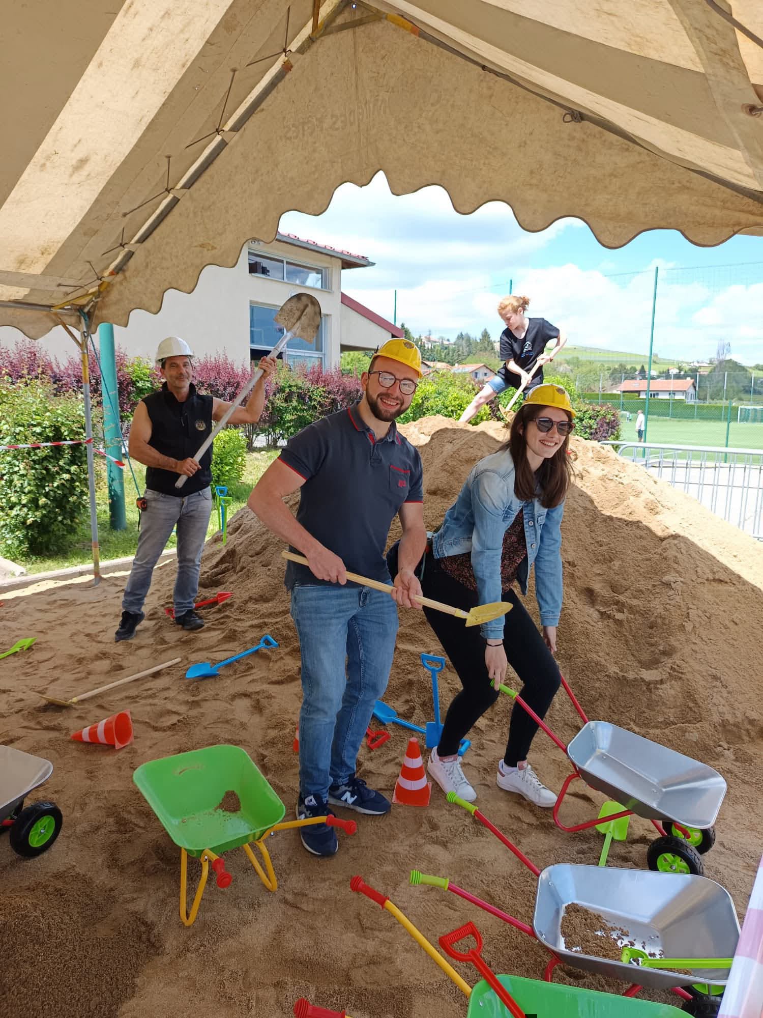 Casque sur la tête, pelle et brouette en main, ils entrent dans la peau de véritables bâtisseurs. Ensemble, ils participent à la construction d’un volcan monumental de sable, pièce centrale de l’animation.