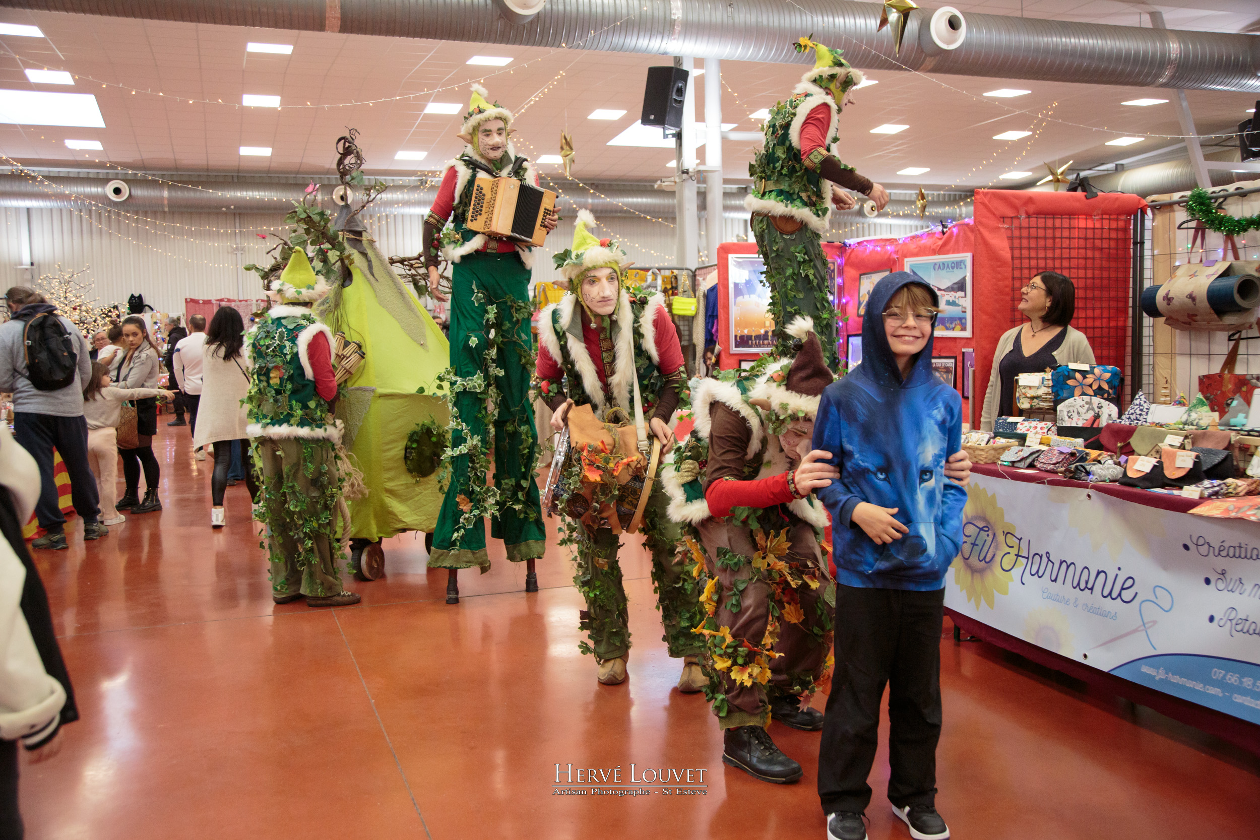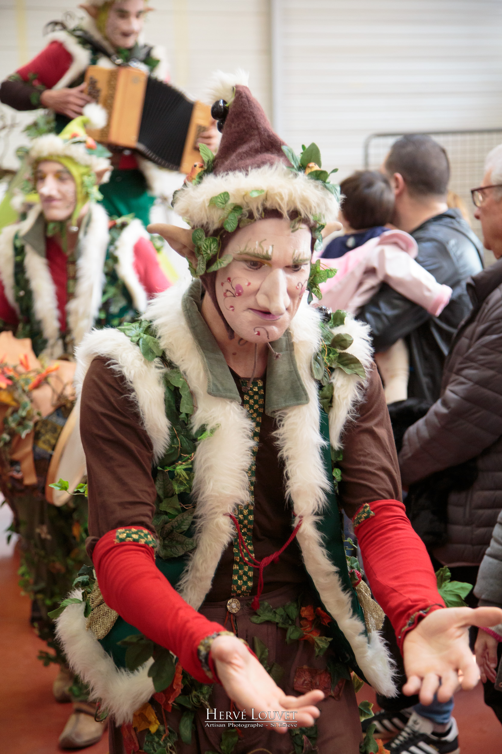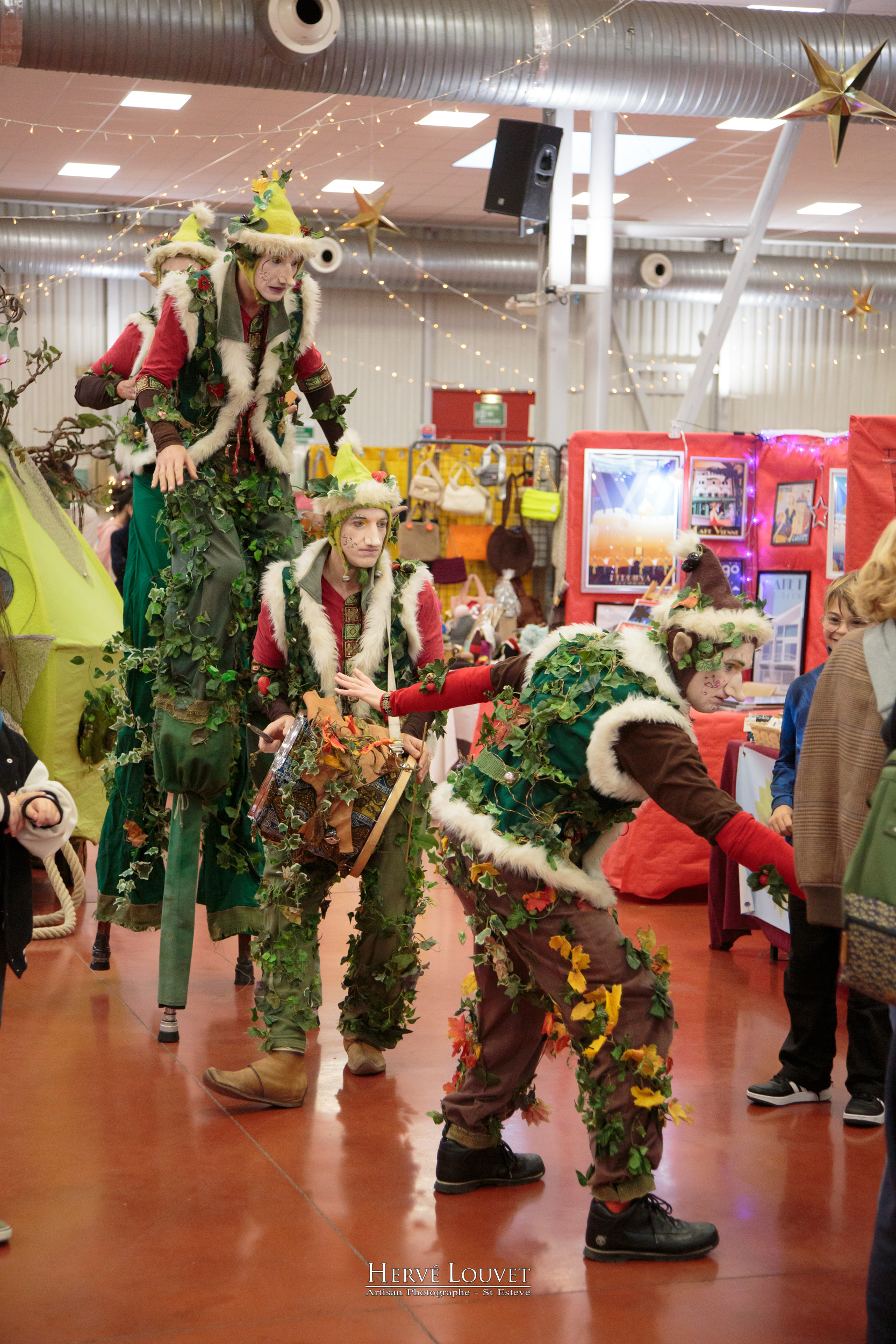 Des Lutins de la Forêt perché sur échasses, musicien, jongleurs de massues. Déambulations Féeriques