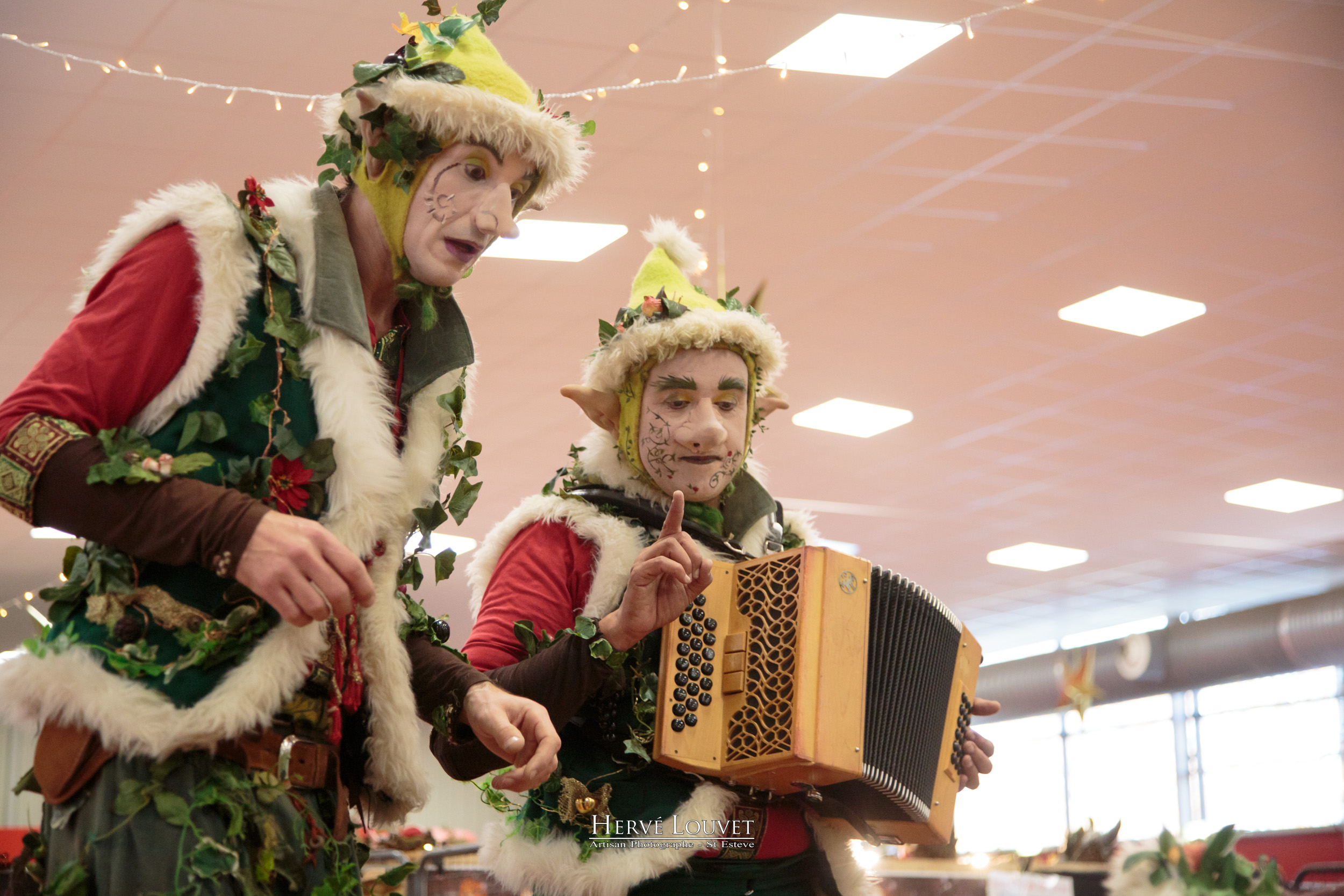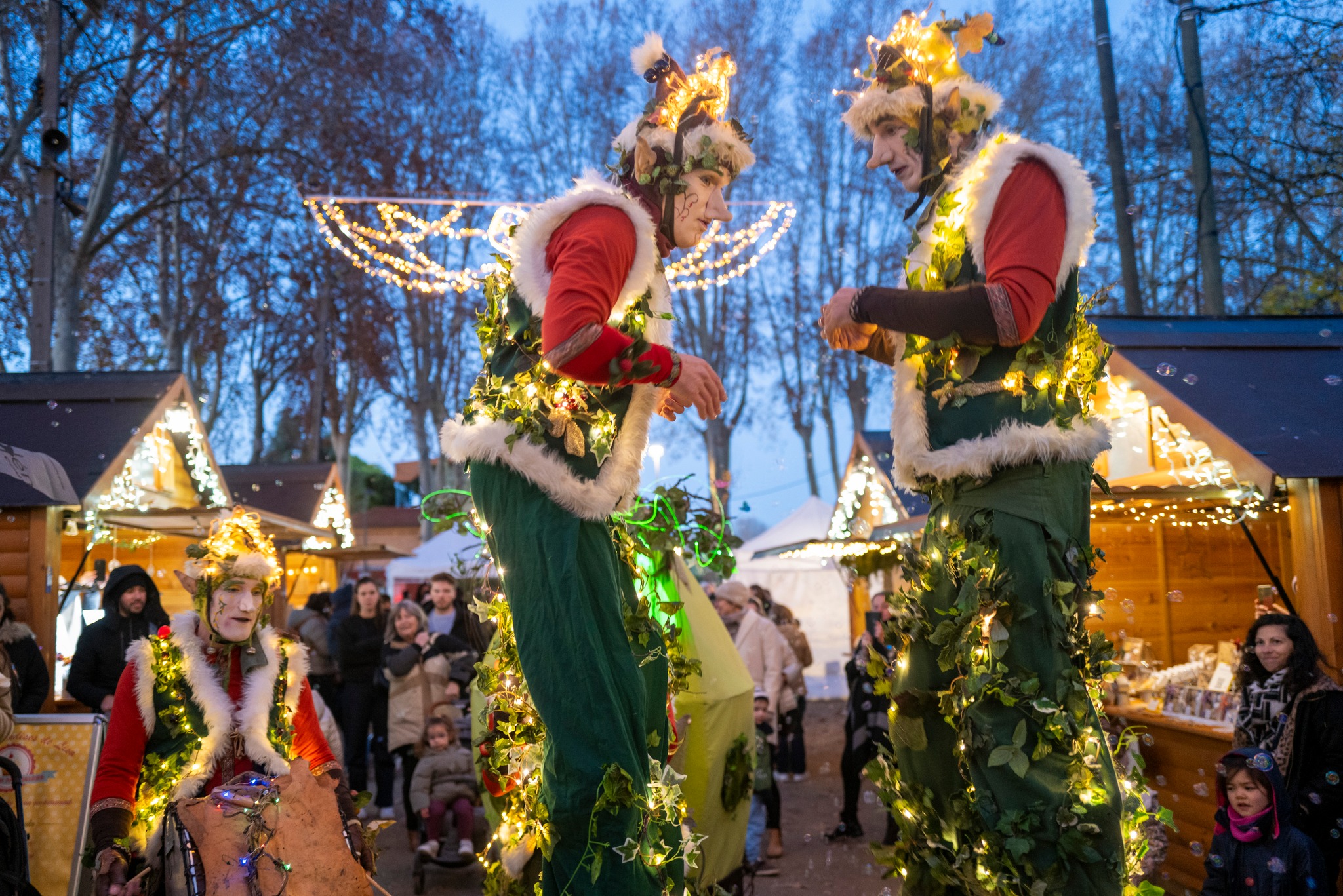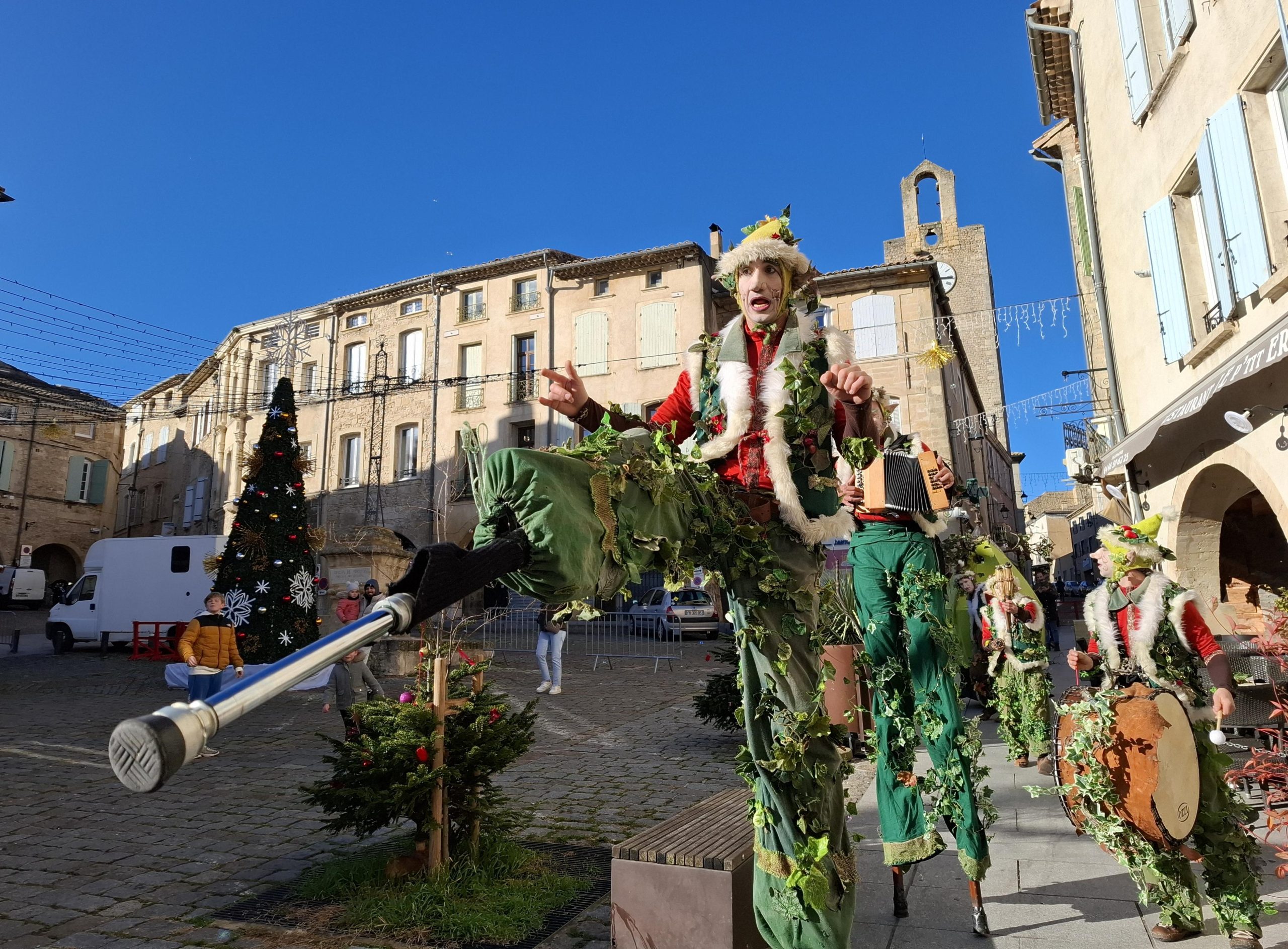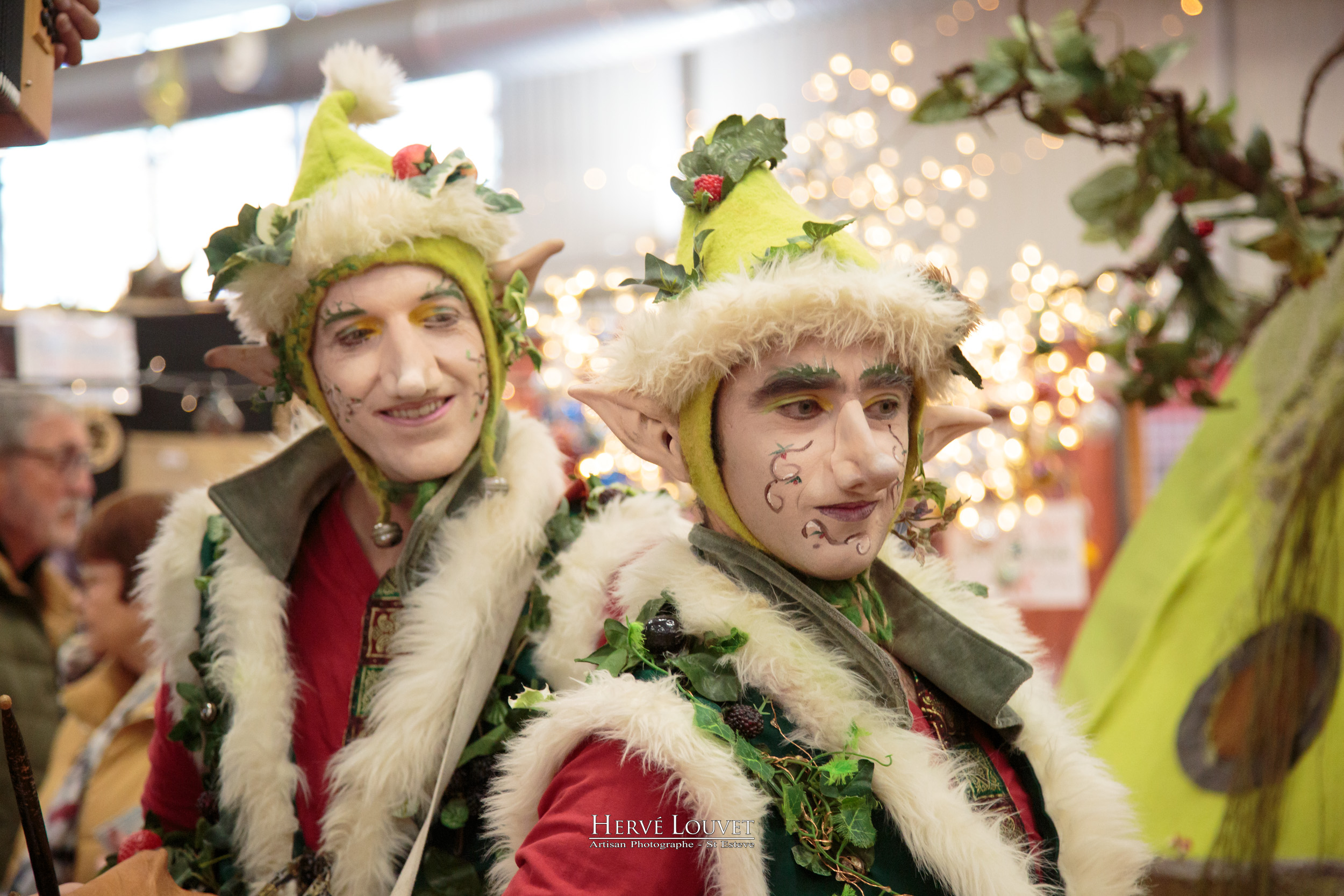 Des Lutins de la Forêt perché sur échasses, musicien, jongleurs de massues. Déambulations Féeriques