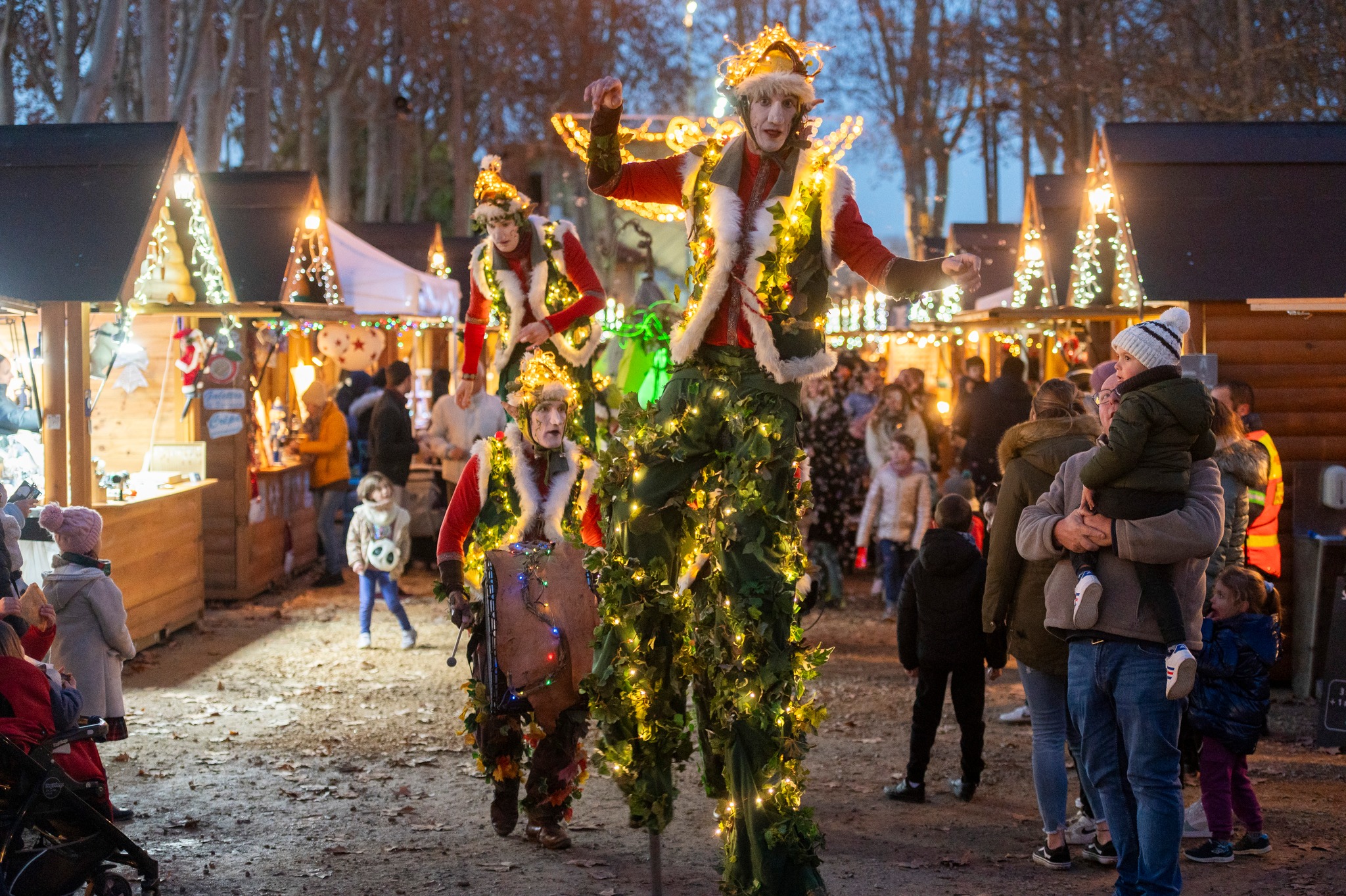 Cinq Lutins pleine de réparti sur des échasses déambulent et amusent petits et grands