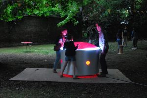 Dans une musique affolante composée en direct par une IA dédiée, la balle se déplace sur le dôme, et si personne n’est présent à l’endroit où elle touche le bord, l’équipe perd un point. Dans le cas contraire, elle rebondit vers l’autre côté, et un point est gagné. Si le score tombe à zéro, la partie est perdue, si il arrive à 12 c’est gagné ! Le jeu se joue en trois manches de difficulté croissante.