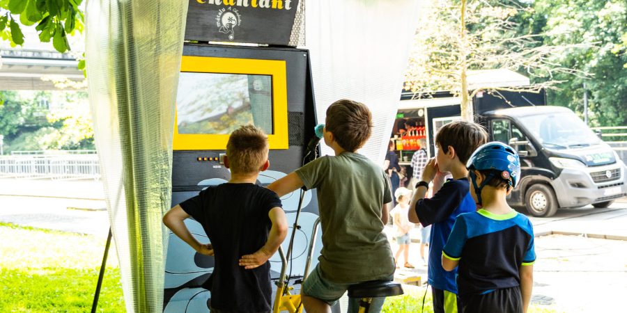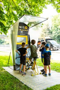 Le Vélo en chantant consiste à faire une balade à vélo immobile, mais en chantant ! Sur un panneau, décoré façon tour de France, se trouve un grand écran sur lequel un vélo défile sur une route. Assis sur la selle, le micro devant la bouche, le joueur chante la petite mélodie que l’on entend en arrière-plan. La route devient alors une sorte de partition pour les chanteurs-cyclistes : plus on chante aigu, plus le vélo monte sur l’écran et plus on chante grave, plus le vélo descend sur l’écran. Chanter juste permet de rester sur la route !