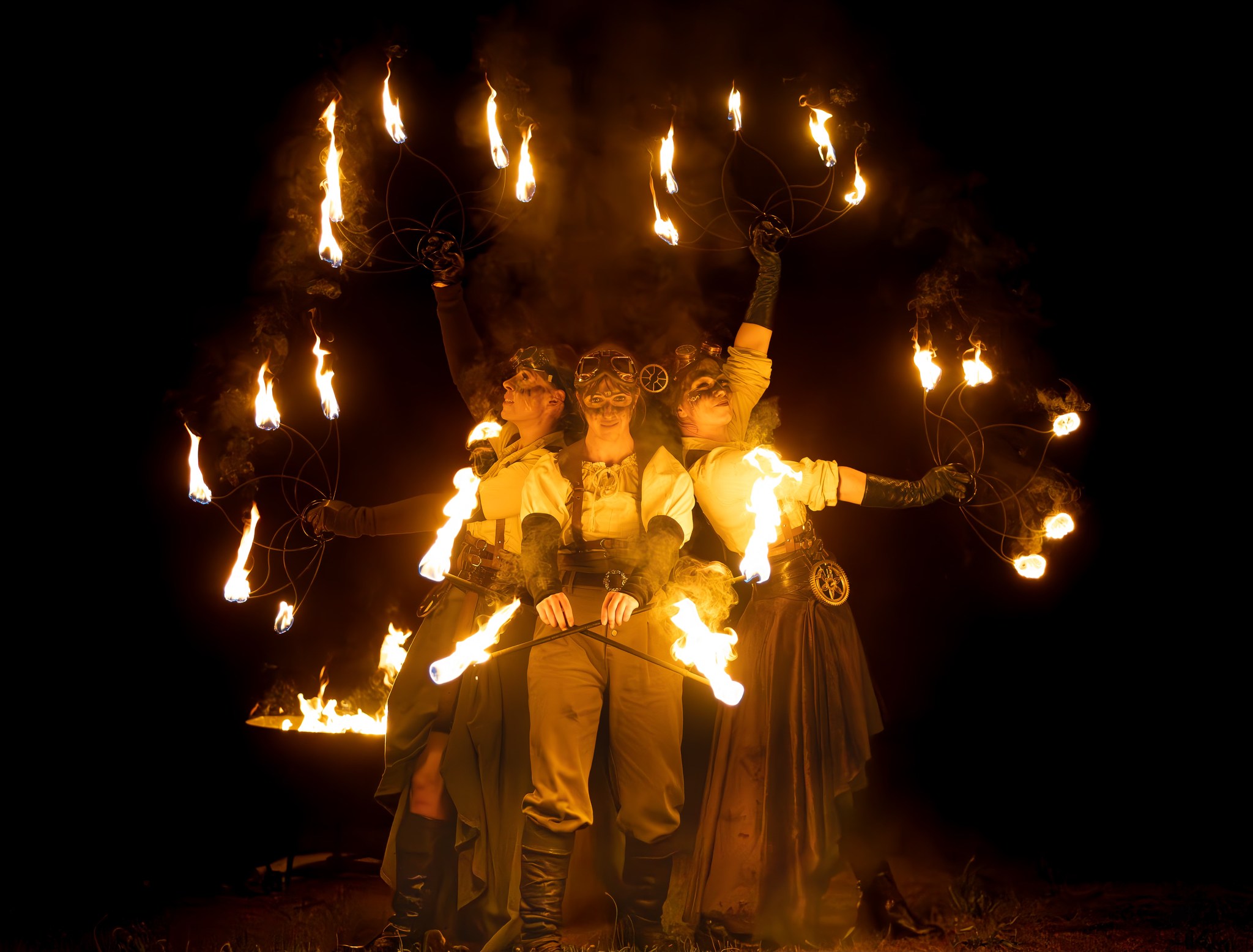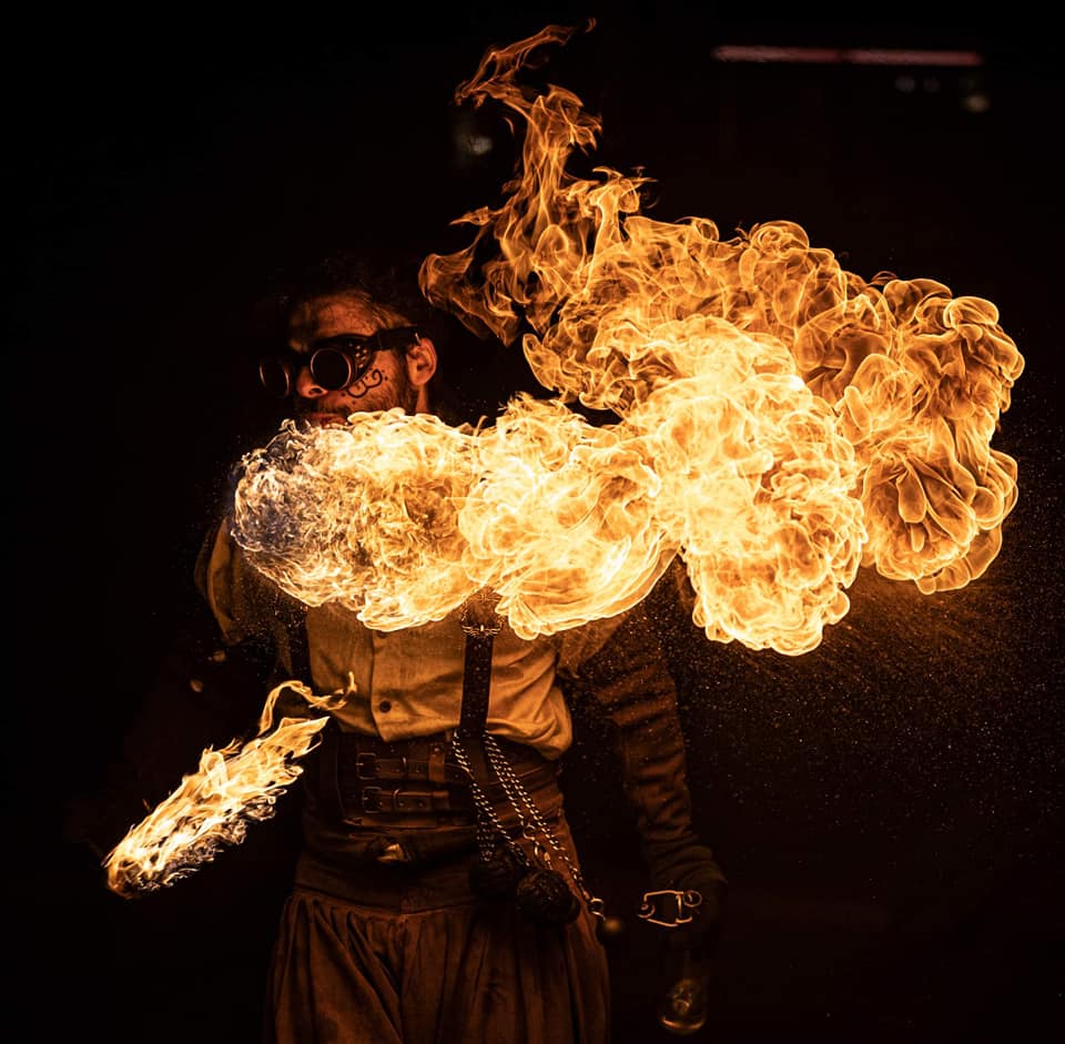 Bolas, mains de feu, Staff, éventails enflammés, combats à l’épée de feu … la flamme devient une partenaire évanescente dans les mains de nos jongleurs.