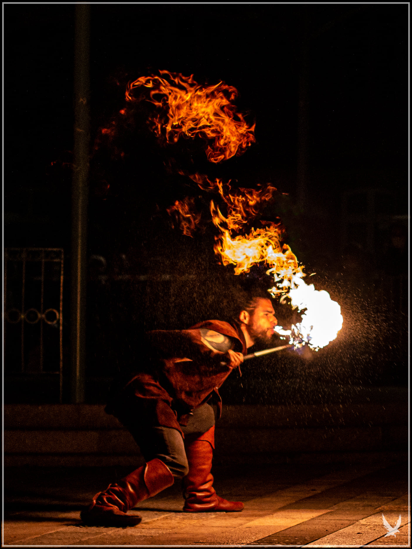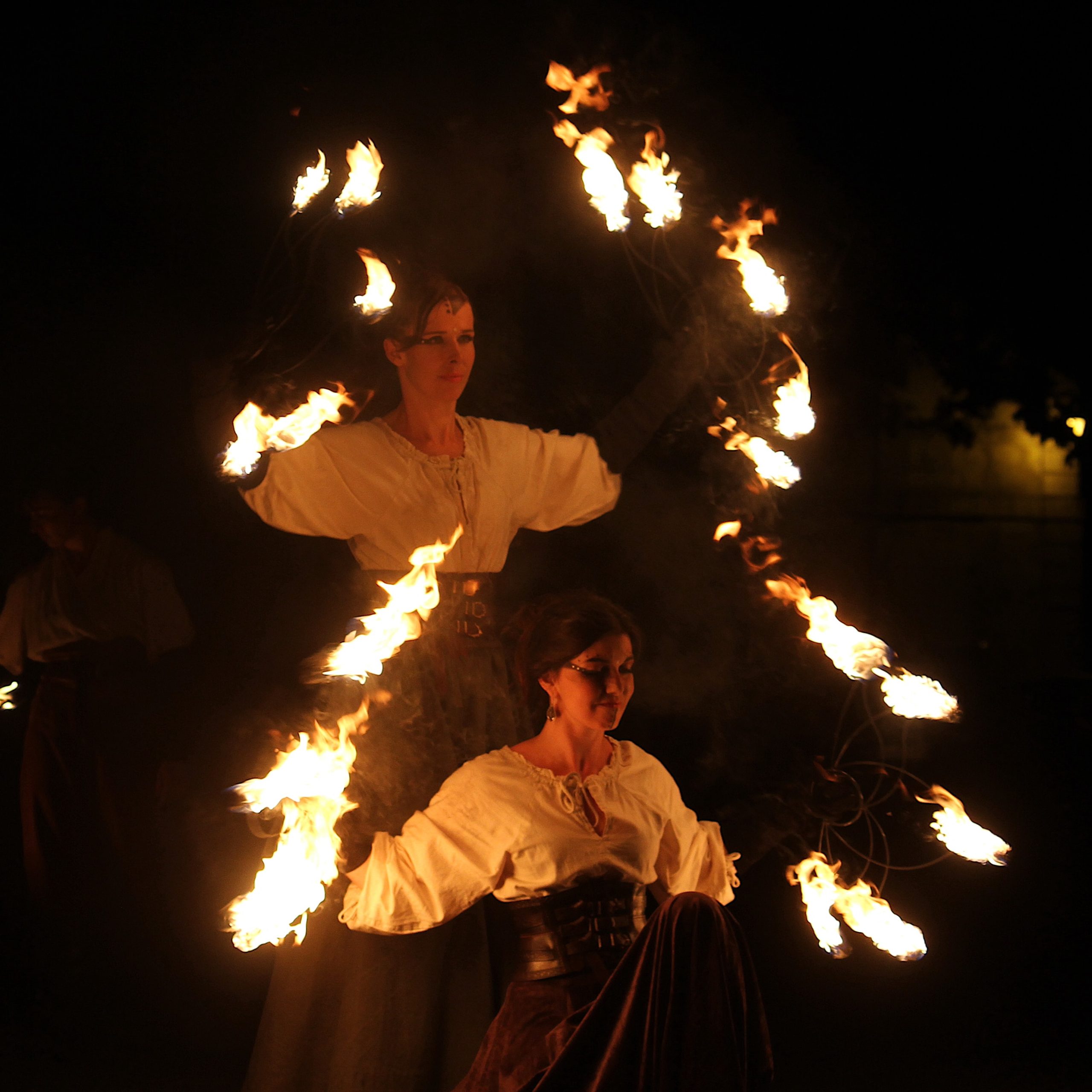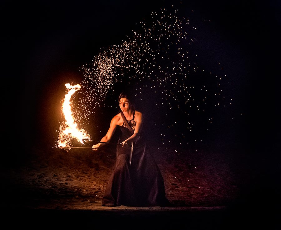 Bolas, mains de feu, Staff, éventails enflammés, combats à l’épée de feu … la flamme devient une partenaire évanescente dans les mains de nos jongleurs.