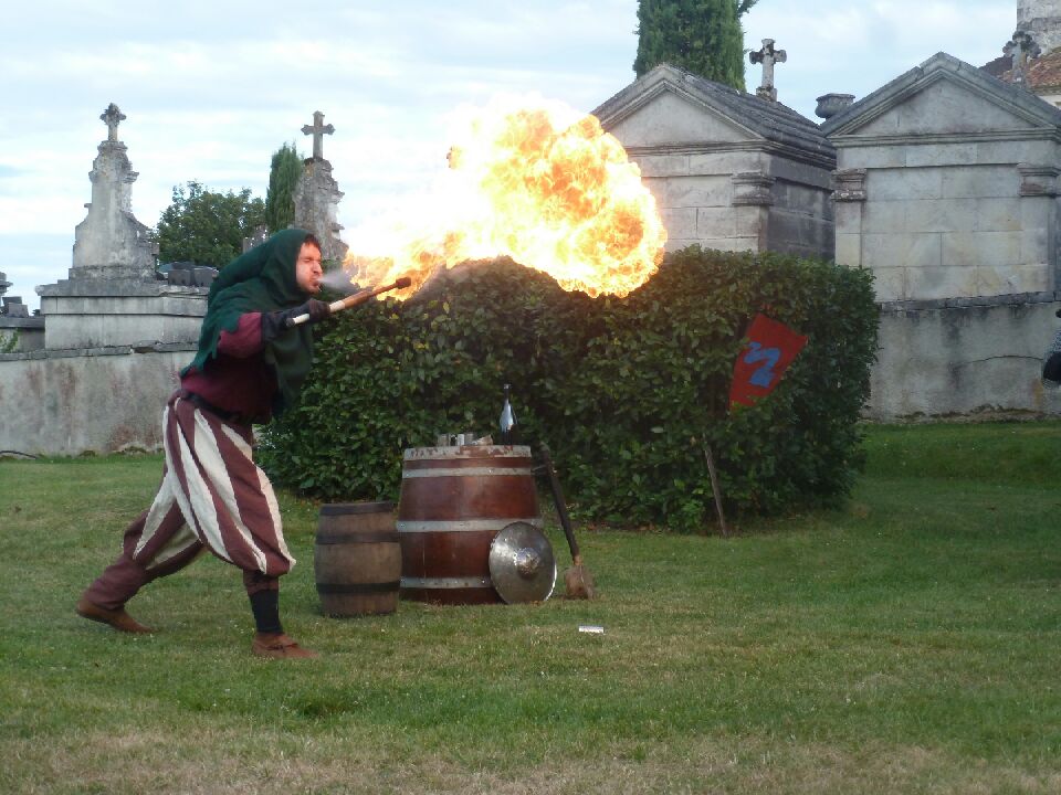 Nous présentons des spectacles vivants de 20 à 40 minutes mettant en scène des épopées médiévales où se mélangent des combats avec diverses armes (épée,dague, hache, lance, masse …), jonglage, et effets pyrotechniques.