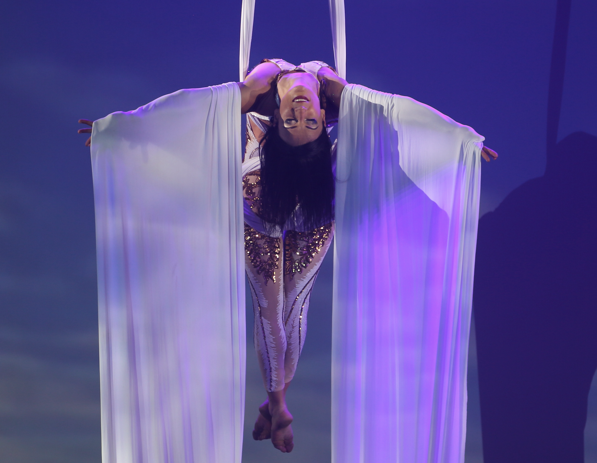 Un ballet sur tissu aérien impressionnant où les figures acrobatiques se succèdent.